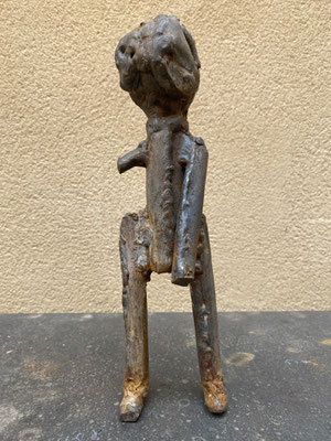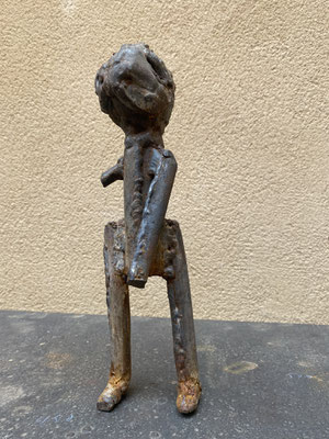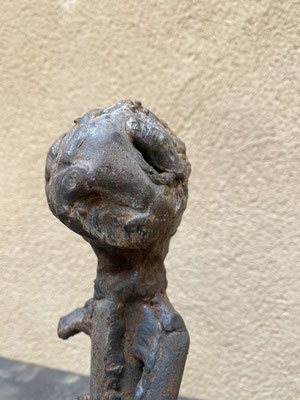 Cette petite figure semble sortie tout droit d’un monde intérieur. Soudée à partir de morceaux de fer récupérés, elle porte les traces du feu, de la rouille et du temps, tout en dégageant une certaine tendresse. Fragile et déterminée à la fois, elle s’impose dans l’espace.